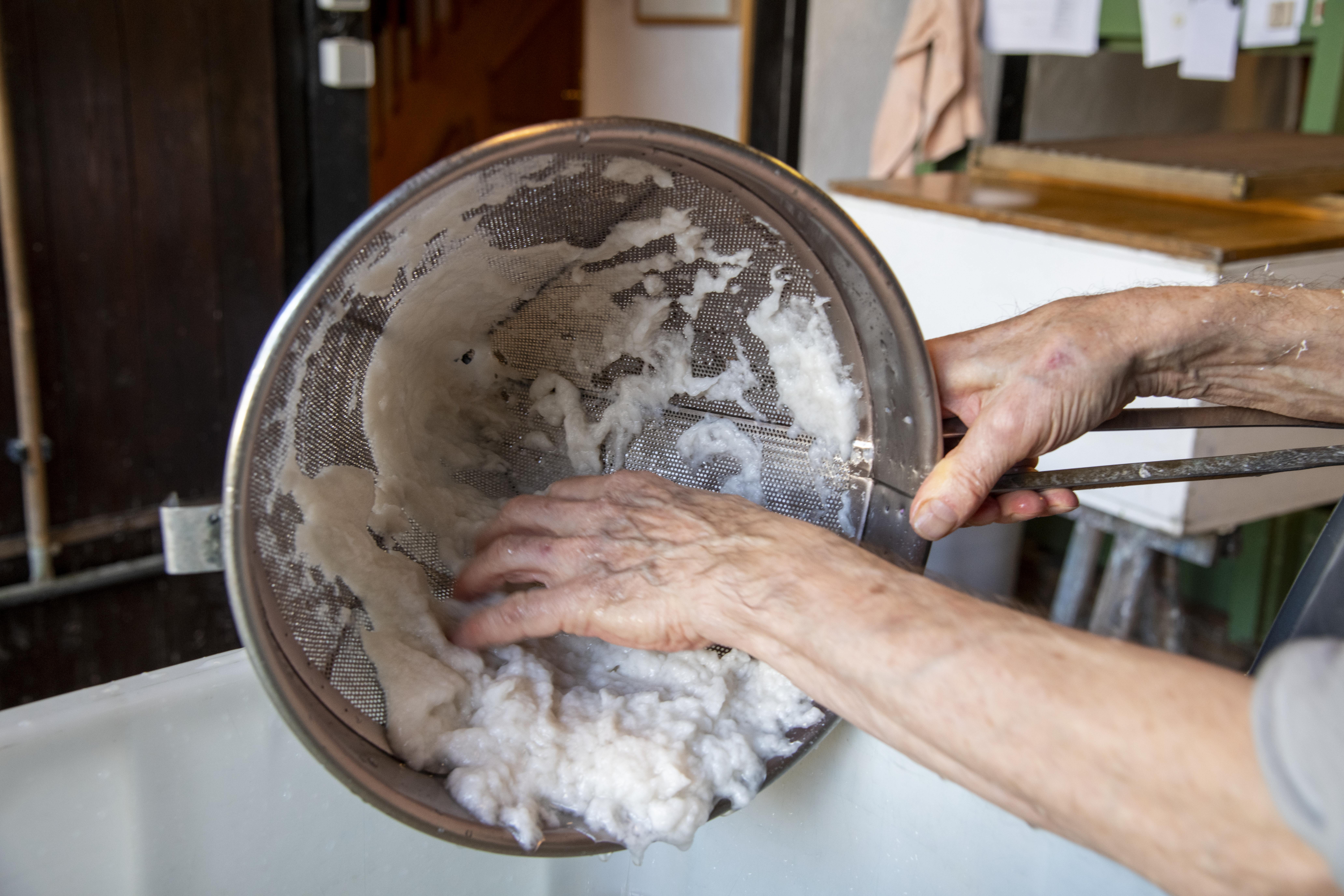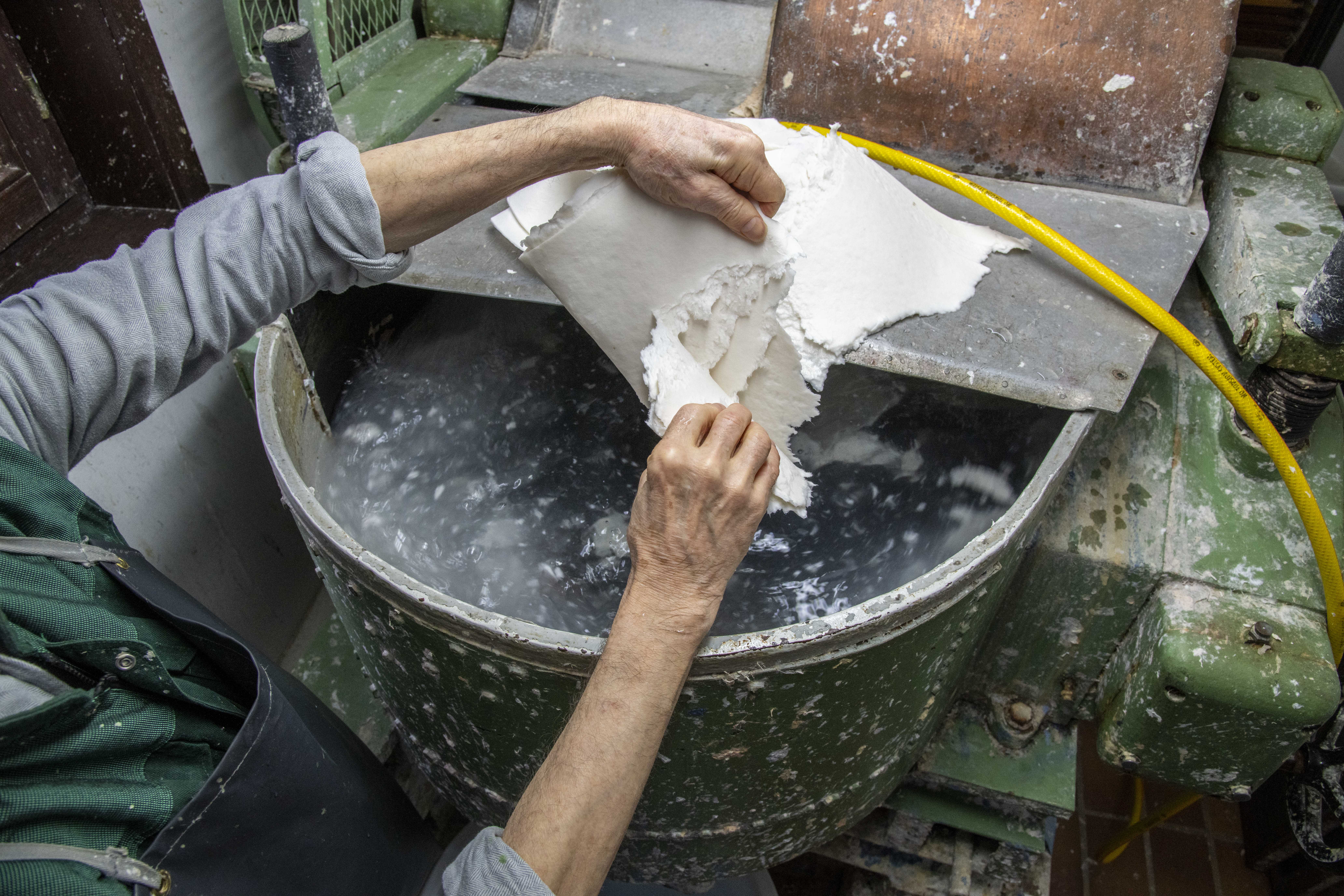 Aufbereitung der Papierfasern: Der Faserbrei wird abgesiebt und von Hand weiterverarbeitet, bevor daraus neue handgeschöpfte Papierbögen entstehen.