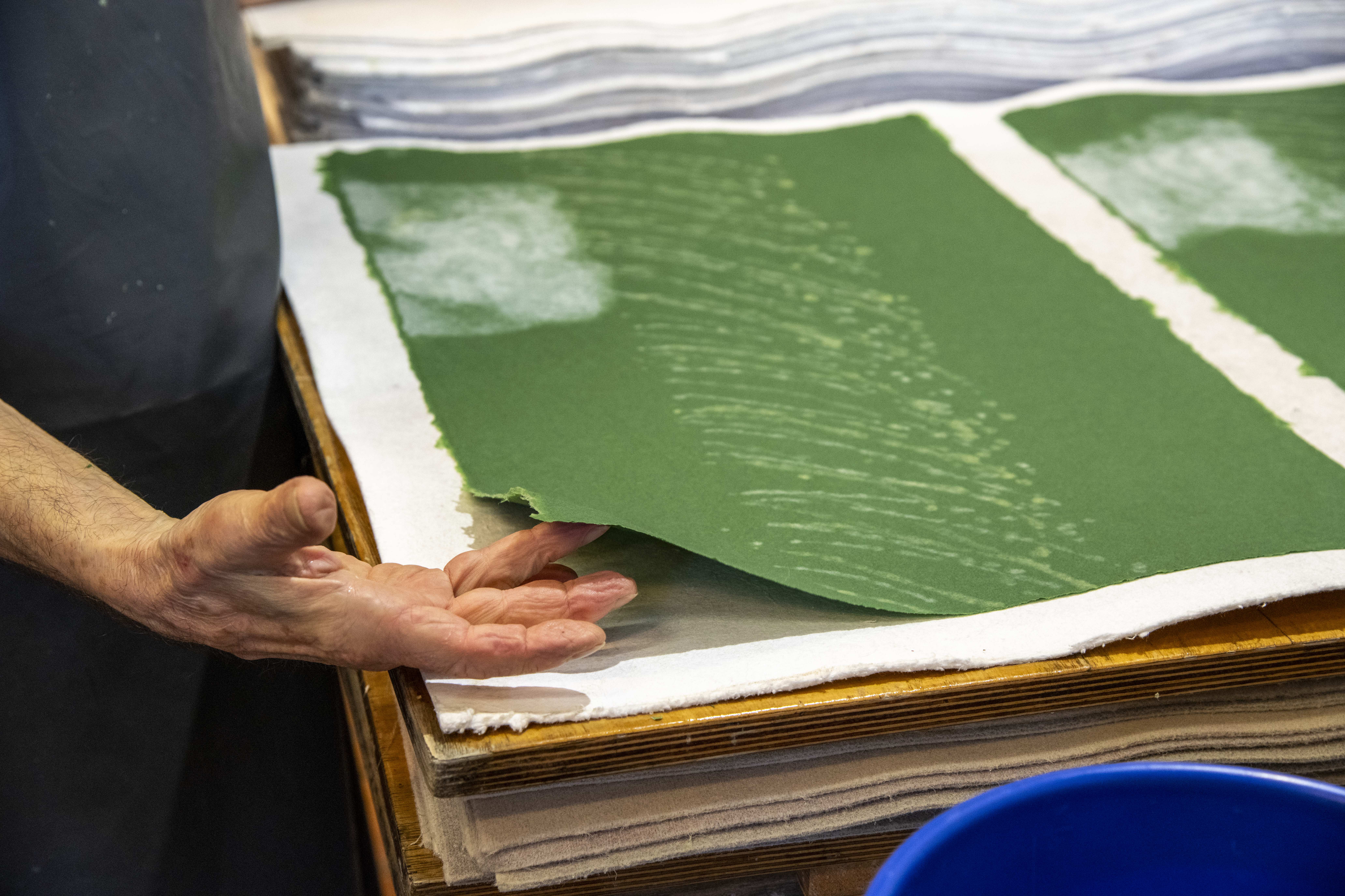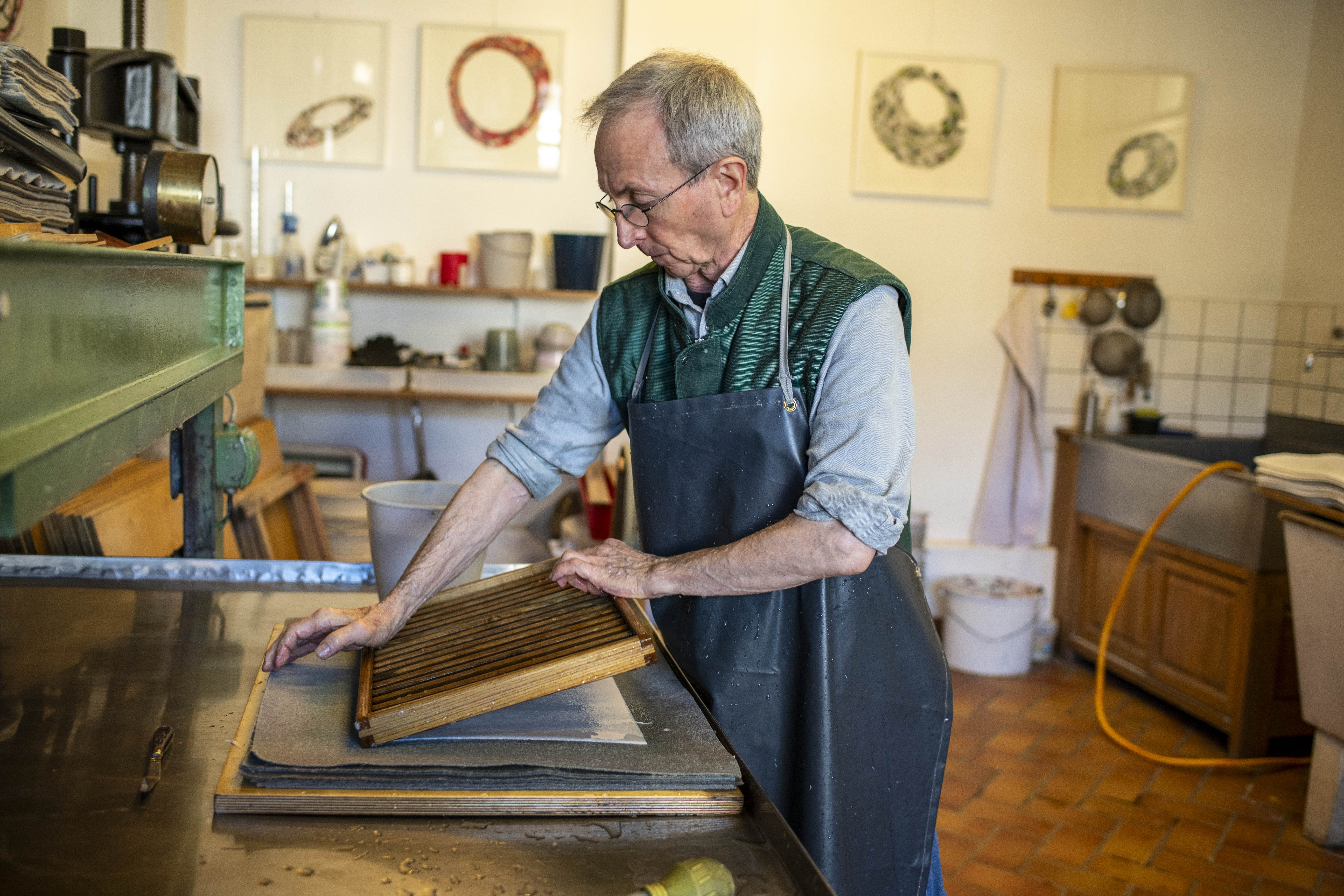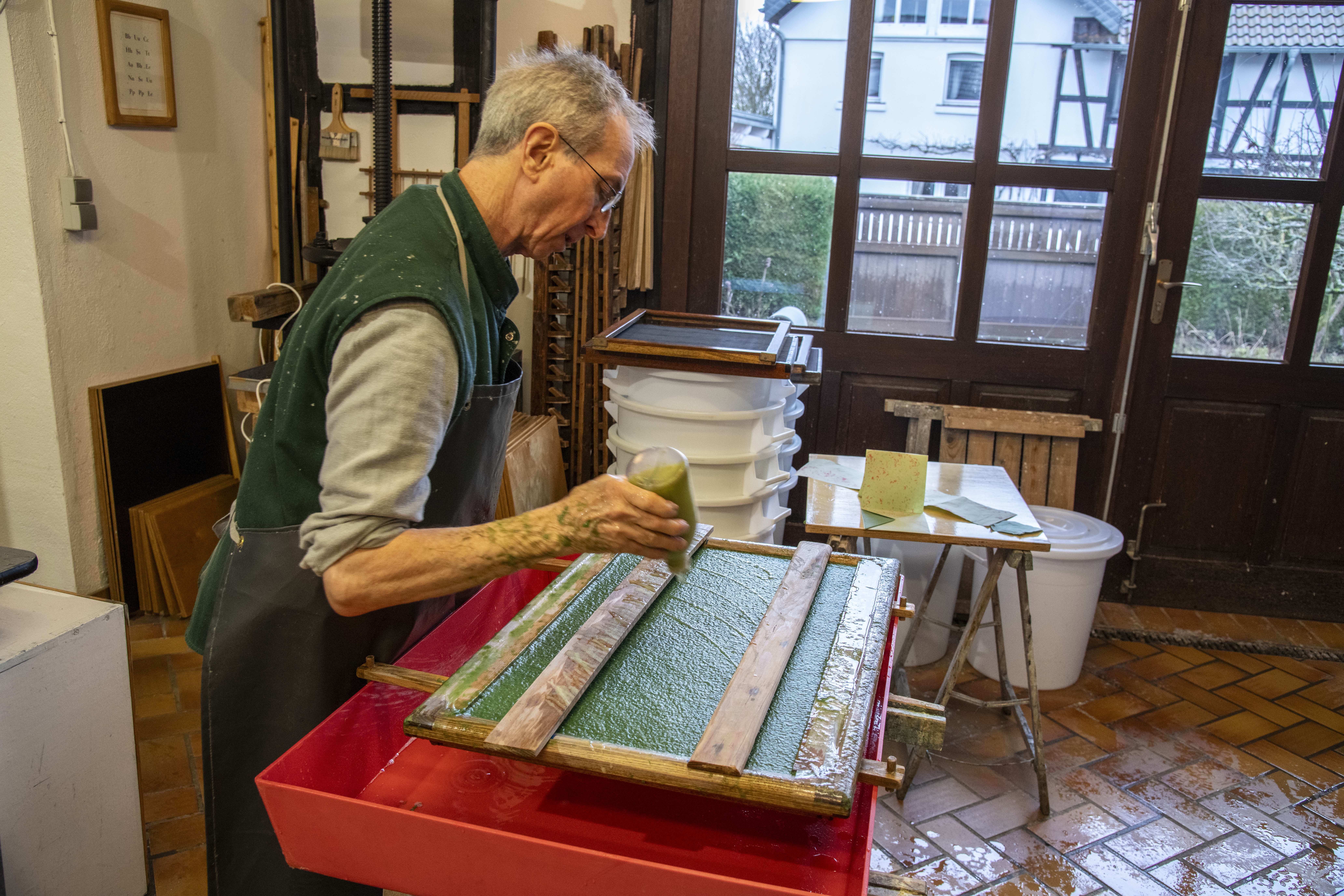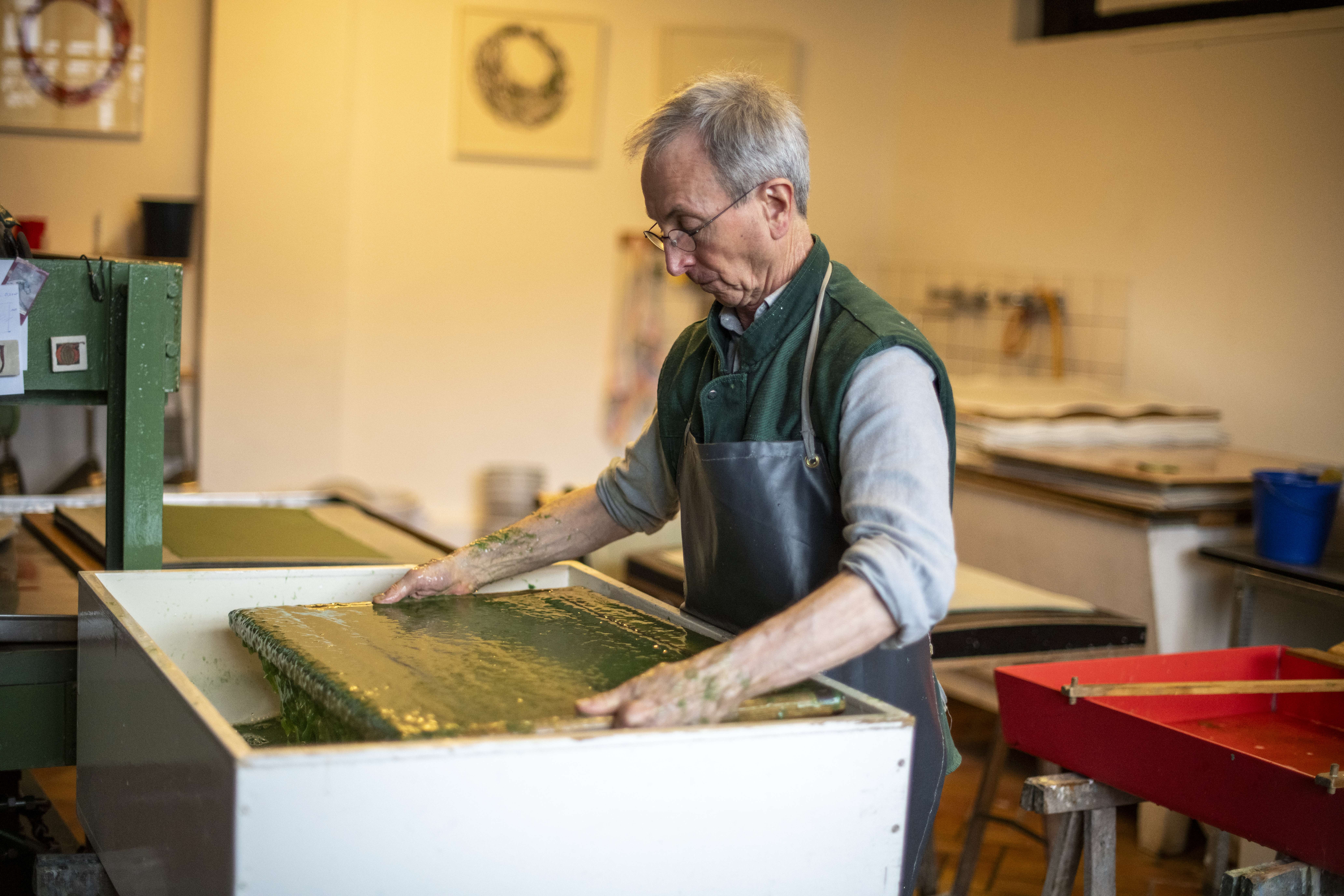 John Gerard beim Papierschöpfen in seinem Atelier – hier wird aus Fasern, Wasser und Papierbrei ein einzigartiger Papierbogen.